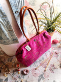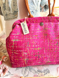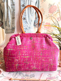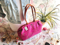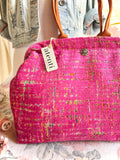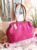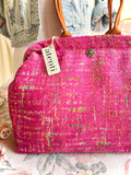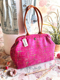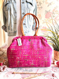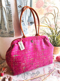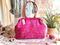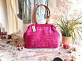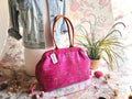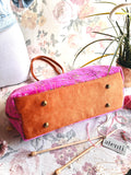 Decadent and vibrant cut velvet, with peeps of colors coming through the bold pink. Classy and fun! Opening with a 12" rectangular snap frame, the Niki Molly carpet bag shows off a fully lined water resistant taffeta interior. Inside are a...