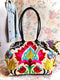 An elegant framed desert floral design with strong Spanish influence. A heavy cotton linen in a colorful Suzani patterned print- same design but different color way from our Santa Monica. The bright colors are artfully showcased against a sandy background. The Lolita is an open tote with a magnetic closure and a large detachable interior pouch 12" x 10" x 3" in matching fabric. Both pieces are fully lined with water resistant taffeta. The outside shell bag includes a zippered pocket and an open divided pocket with a cell phone slot. The Lolita has about a 10.5" drop (the distance from the top of the strap to the top of the bag's body).
