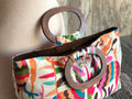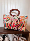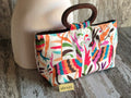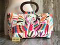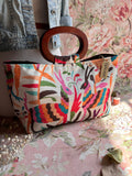 Our new Divina design in a fun and colorful printed velvet featuring bold whimsical animals. Seamless design of classic vintage with modern flare create a perfect statement piece that can be worn year round. This bag features wooden handles, a magnetic closure, and feet.