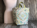 A roomy stand-alone project bag. Top rolls down for easy access. Wide opening and two handles. Fully lined in water our light tan water repellent taffeta. Inside are three pockets. Your crafting essentials, in one carryall. Designed with a spacious interior, this luxurious project bag effortlessly stores all your supplies and keeps them protected with a water-repellent taffeta lining. With a convenient top roll-down feature and two sturdy handles, access is a breeze. Say goodbye to clutter and hello to a stylish and functional solution for all your projects.